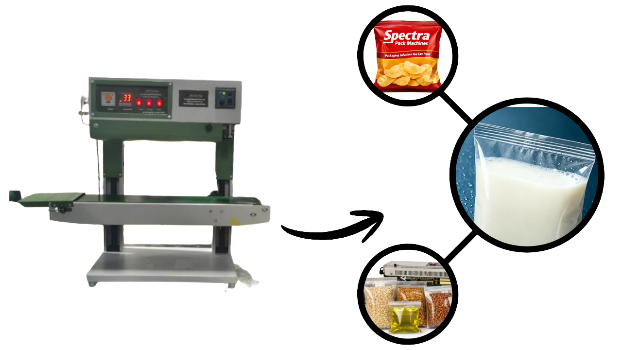 A Vertical Band Sealer Machine – Indian Model is a continuous sealing machine designed for sealing pouches in a vertical position. It is ideal for packing powders, liquids, and granules, ensuring strong, leak-proof, and neat sealing. Perfect for industries like food, pharmaceuticals, and chemicals.